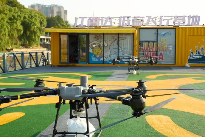 接着,师生一行来到了下关地区长江边南京港,在这里观看了长江汇科技有限公司的江翼达·低空飞行基地。在这里,飞行员操纵直升机,向师生展示了利用无人机向在长江航行中的货轮递送物资和外卖的过程。同学们对此过程表示惊奇,迫切向科技负责人询问其设计原理。负责人从机型的外观设计,承载的重量,以及无人机、货轮之间运动速度的匹配等方面为大家解答,让同学们对于科技赋能的强大力量再次有了实感。