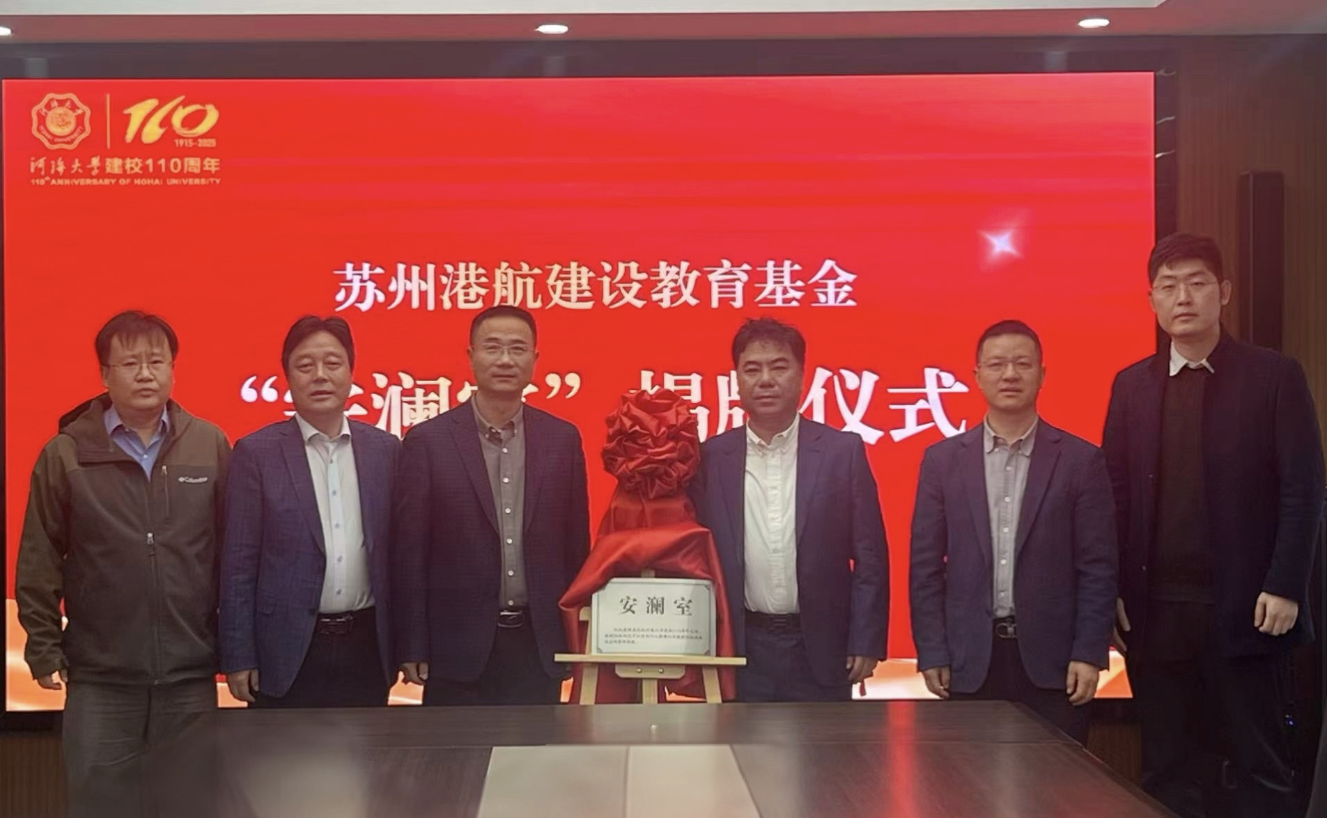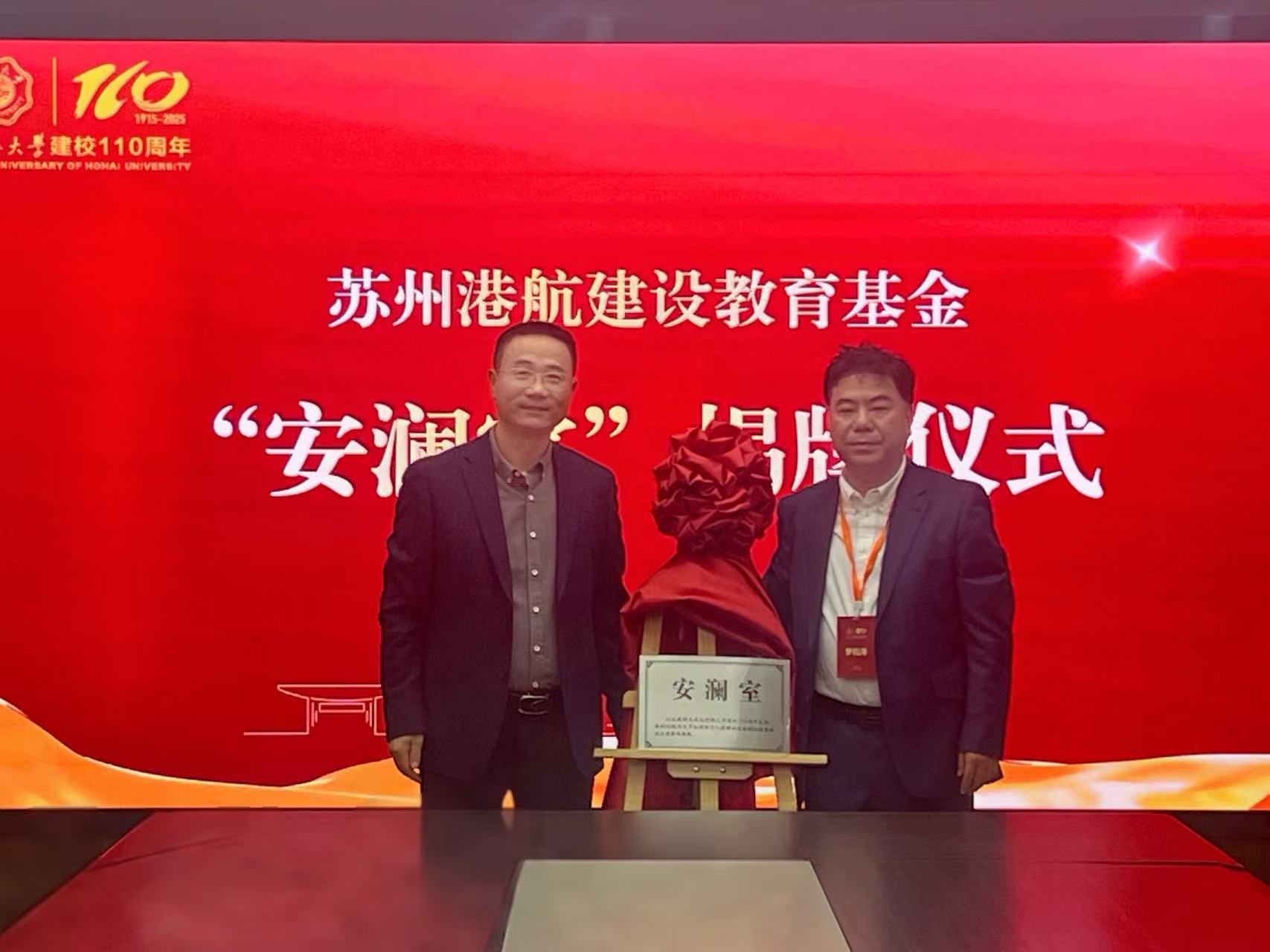 情系教育,润泽芳华。在我校喜迎110周年校庆之际,苏州港航建设工程有限公司慷慨捐资110万元人民币,设立“苏州港航建设教育基金”,用以激励我院莘莘学子奋发成才,支持学院教育事业长远发展。为铭谢此善举,学院特以公司名义及1996级港航校友冠名学院502会议室,取意“江河安澜,人才蔚然”,定名为“安澜室”。