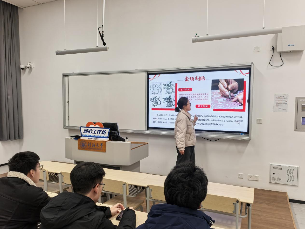 讲解结束后,刻纸实践环节开启。主讲人分发刻刀、纸、铅笔、垫板及模板,模板融入校庆数字、校园建筑等元素,兼具非遗韵味与校庆祝福。唐晶同学现场指导,示范工具使用与安全须知,为初次接触刻纸的同学答疑纠错。同学们专注创作,先描轮廓再精雕细刻,面对细密线条屏息凝神,相互交流互助,现场氛围专注融洽。