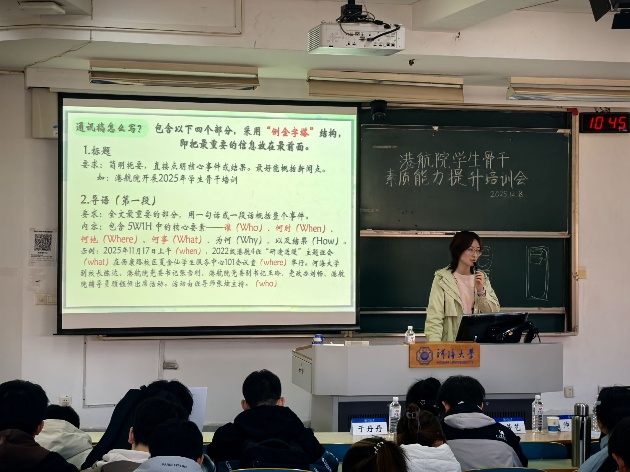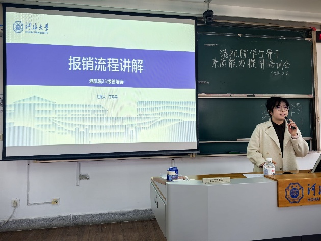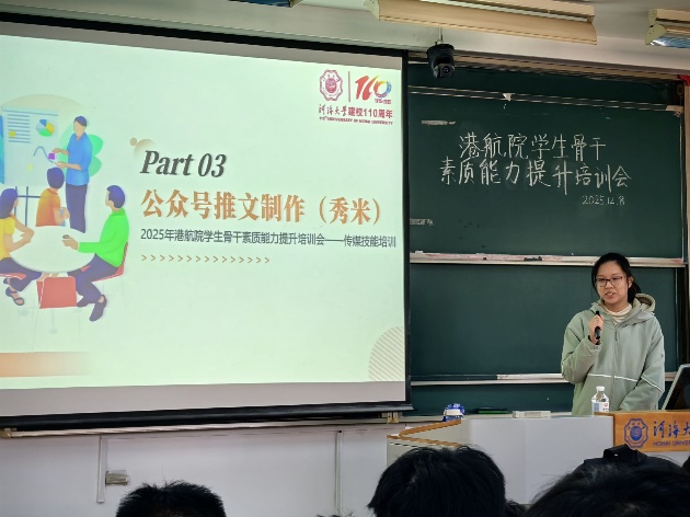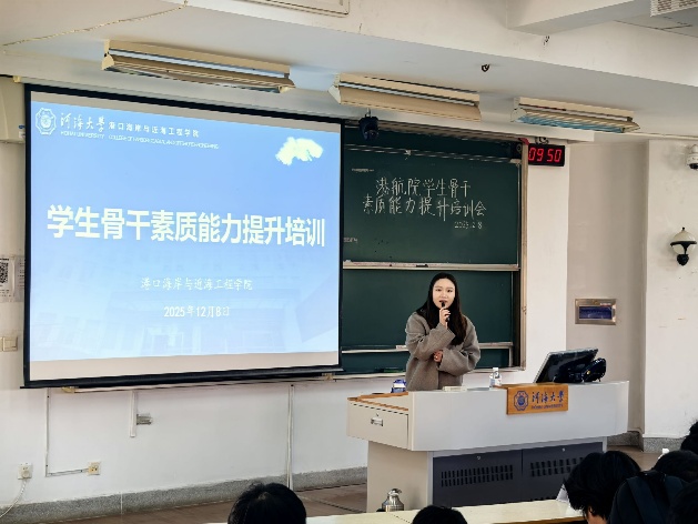 为帮助学生组织骨干快速适应学生组织工作,提升综合素质与实务能力,12月8日上午,港航院在河海大学江宁校区致高楼B201举办了“港航院学生组织骨干素质能力提升培训会”。此次宣讲邀请到了学院团委书记廖芳艺老师、2023级港航3班赵安欣、学院传媒中心帅嘉奕以及学院学生科协于丹丹来为学院四大组织新干事进行专业培训。