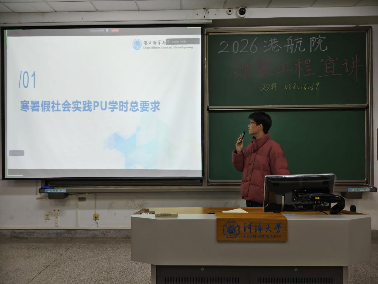12月24日晚,我院在致高楼 B211 教室成功举办 2026 年“源泉工程”招生宣传寒假社会实践宣讲会。本次宣讲会由学院团委实践部组织,院团委实践部副部长李奕昂、海资1班班长洪晨皓担任主讲,线上线下参与学生总计超过300人。