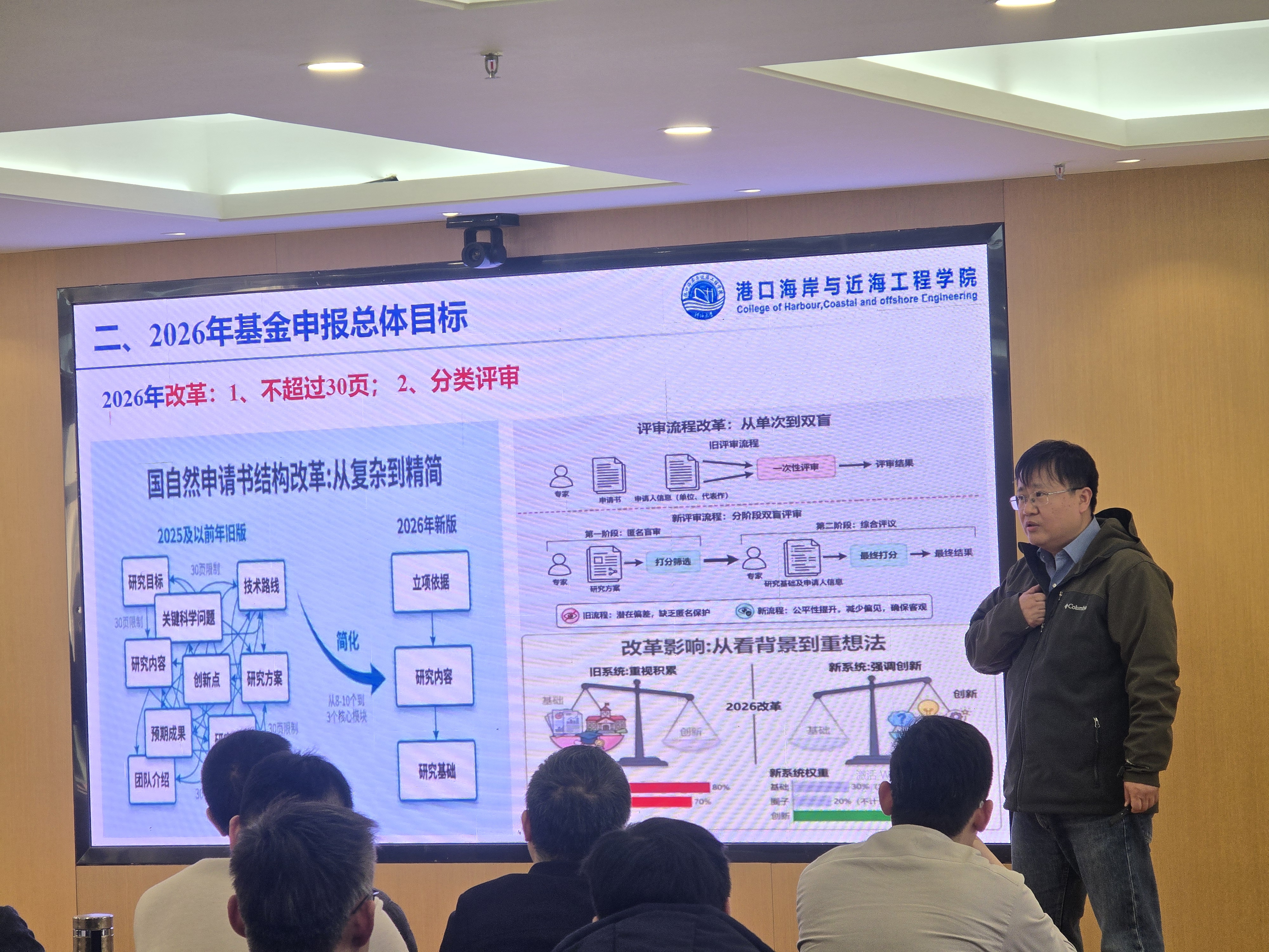 最后,张蔚副院长作学院“十四五”基金工作总结及2026年基金目标报告。报告系统回顾了“十四五”期间学院基金工作的整体推进情况,全面梳理了学院国家基金申报现状、存在问题,并结合学院发展规划,提出了2026年基金工作的目标任务与推进举措。