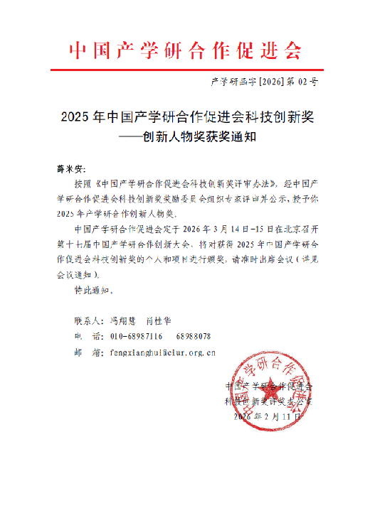 3月15日,第十七届中国产学研合作创新大会在北京举行。大会颁发了2025年度“中国产学研合作促进会科技创新奖”457项,其中创新人物奖122项,创新成果奖335项。我院教师薛米安教授荣获2025年中国产学研合作创新人物奖。